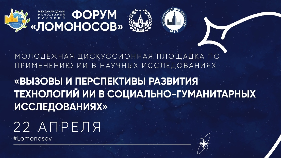 22 апреля молодежная дискуссионная площадка "Вызовы и перспективы развития технологий ИИ в социально-гуманитарных исследованиях" объединит молодых исследователей социологического факультета, исторического факультета, факультета психологии, а также высшей школы современных социальных наук. Организаторами площадки стали следующие студенческие научные общества: НСО социологического факультета МГУ, СНО ВШССН, СНО исторического факультета МГУ, НСО факультета психологии. Спикером от социологического факультета выступит Смирнов Владимир Алексеевич, д.соц.н., профессор кафедры современной социологии. Место проведения: коворкинг 1 гуманитарного корпуса МГУ. Дата и время работы площадки: 22 апреля 2026, 18:00 (регистрация для участников НЕ из МГУ до 19 апреля)