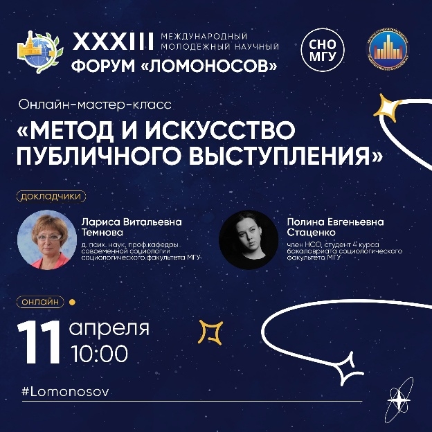 11 апреля в 10:00 социологический факультет приглашает всех желающих на онлайн мастер-класс «Метод и искусство публичного выступления». Спикерами выступят Темнова Лариса Витальевна, д. псих. наук, профессор кафедры современной социологии социологического факультета; Стаценко Полина Евгеньевна, член НСО, студентка 4 курса бакалавриата социологического факультета. Ссылка на регистрацию