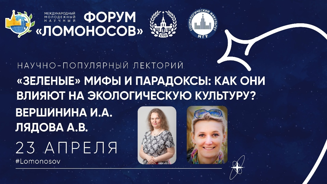 23 апреля в коворкинге 1 ГУМа в 12:20 в рамках научно-популярного лектория МГУ проф., д.с.н. Вершинина Инна Альфредовна и доц., к.с.н. Анна Васильевна Лядова прочитают лекцию «Зеленые» мифы и парадоксы: как они влияют на экологическую культуру?». Вследствие современных реалий, конструирование экологической культуры и соответствующих представлений и практик населения выступает как удобный механизм закрепления «нужного» понимания обществом «правильного» курса зеленого и устойчивого развития. Лекция посвящена обсуждению, как происходит конструирование зеленых фейков и поиску ответов на вопрос: почему, несмотря на все усилия, мир не становится зеленее. Ссылка на научно-популярный лекторий